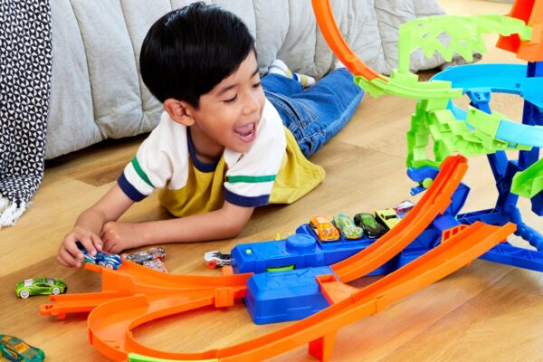 Flip the diverter to race off to other challenges. Amp up the thrills by adding more 1:64 scale cars to see how long before there’s a mid-air crash. The set has a handle and foldable storage for portability.