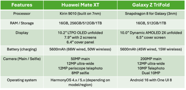 The Galaxy Z TriFold has a different hinge design, folding inward from two sides, whereas the Huawei Mate XT models take on a Z shape when being folded.